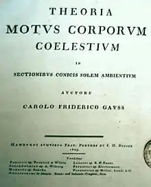 - Gauss, Carl Friedrich; Davis, Charles Henry (1857). Theory of the Motion of the Heavenly Bodies Moving about the Sun in Conic Sections. Boston: Little, Brown and Company. p. 2.
