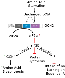GCN2 is the only known eukaryotic initiation factor 2α kinase (eIF2α) in Saccharomyces cerevisiae.[1] It inactivates eIF2α by phosphorylation at Serine 51 under conditions of amino acid deprivation, resulting in repression of general protein synthesis whilst allowing selected mRNA such as GCN4 to be translated due to regions upstream of the coding sequence. Elevated levels of GCN4 stimulate the expression of amino acid biosynthetic genes, which code for enzymes required to synthesize all 20 major amino acids.