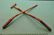 A gee-haw whammy diddle is a mechanical toy consisting of two wooden sticks. One has a series of notches cut transversely along its side and a smaller wooden stick or a propeller attached to the end with a nail or pin. This stick is held stationary in one hand with the notches up, and the other stick is rubbed rapidly back and forth across the notches. This causes the propeller to rotate. Sometimes also known as a ouija windmill, a hoodoo stick or a VooDoo stick. The word whammy is sometimes whimmy, and the word diddle sometimes doodle, giving it three possible other names, and the gee-haw may also be dropped.