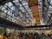 Gemini has one of the highest capacities of any ride in the park.[5] Gemini's station previously featured a double-sided entry, allowing guests to enter the station from both the front and the back. Eventually modified to have guests only enter from the back of the station, the stairway formerly used for the queue at the front of the station still remains. Originally, Gemini operated 3 trains on each side of the roller coaster for a total of 6 trains. Gemini currently operates with 4 trains (2 on each side).