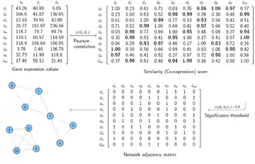 The input data for constructing a gene co-expression network is often represented as a matrix. If we have the gene expression values of m genes for n samples (conditions), the input data would be an m×n matrix, called expression matrix. For instance, in a microarray experiment the expression values of thousands of genes are measured for several samples. In first step, a similarity score (co-expression measure) is calculated between each pair of rows in expression matrix. The resulting matrix is an m×m matrix called the similarity matrix. Each element in this matrix shows how similarly the expression levels of two genes change together. In the second step, the elements in the similarity matrix which are above a certain threshold (i.e. indicate significant co-expression) are replaced by 1 and the remaining elements are replaced by 0. The resulting matrix, called the adjacency matrix, represents the graph of the constructed gene co-expression network. In this matrix, each element shows whether two genes are connected in the network (the 1 elements) or not (the 0 elements).