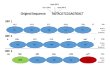 This picture shows how Open Reading Frames (ORFs) can be used for gene prediction. Gene prediction is the process of determining where a coding gene might be in a genomic sequence. Functional proteins must begin with a Start codon (where DNA transcription begins), and end with a Stop codon (where transcription ends). By looking at where those codons might fall in a DNA sequence, one can see where a functional protein might be located. This is important in gene prediction because it can reveal where coding genes are in an entire genomic sequence. In this example, a functional protein can be discovered using ORF3 because it begins with a Start codon, has multiple amino acids, and then ends with a Stop codon, all within the same reading frame.[6]