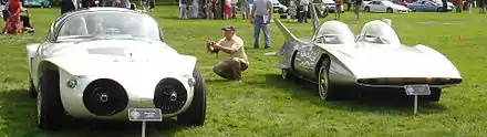 By 1953, the research team had developed the Firebird XP-21.[4] This was later referred to as the Firebird I, which was essentially a jet airplane on wheels. It was the first gas turbine-powered car tested in the United States. The design is entirely impractical, with a bubble-topped canopy over a single-seat cockpit, a bullet-shaped fuselage made entirely of fiberglass, short wings, and a vertical tail fin.[5] It has a 370 hp (280 kW) Whirlfire Turbo Power gas turbine engine, which has two speeds, and expels jet exhaust at some 1,250 °F (677 °C). The weight of the car is 2,500 lb (1,134 kg), with a 100-inch wheelbase.[6]