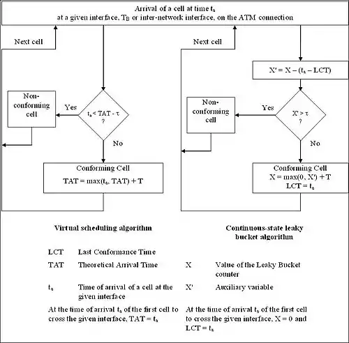 The GCRA is described by the ATM Forum in its User-Network Interface (UNI)[1] and by the ITU-T in recommendation I.371 Traffic control and congestion control in B-ISDN .[2] Both sources describe the GCRA in two equivalent ways: as a virtual scheduling algorithm and as a continuous state leaky bucket algorithm (figure 1).