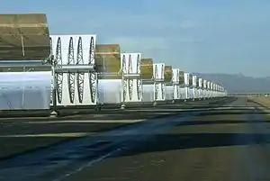 The Genesis Solar Energy Project is a concentrated solar power station located in the Mojave Desert on 1,920 acres (780 ha) of Bureau of Land Management land, in eastern Riverside County, California. The plant is owned/managed by Genesis Solar, LLC, a subsidiary of NextEra Energy Resources, LLC. The Genesis Solar Energy Project is located about 25 miles (40 km) west of Blythe, in the Lower Colorado River Valley.[4] The plant was built in the Colorado Desert along an ancient trade route that native people had traveled for thousands of years. The route traversed the Sonoran Desert and enabled trade between the Colorado River and the coast.[5][6]