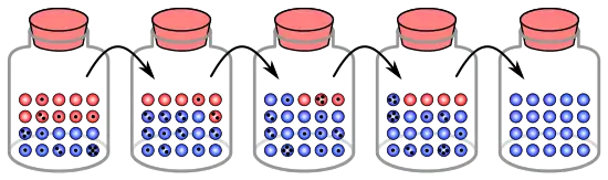 In any one generation, no marbles of a particular colour could be chosen, meaning they have no offspring. In this example, if no red marbles are selected, the jar representing the new generation contains only blue offspring. If this happens, the red allele has been lost permanently in the population, while the remaining blue allele has become fixed: all future generations are entirely blue. In small populations, fixation can occur in just a few generations.