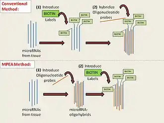 MPEA: the MPEA technique utilizes microfluidic technology to ensure the correct timing and consequently the correct alignment of the capture probes with the microRNA molecules. Conventional methods of probe-microRNA hybridization require prior treatment of microRNAs with potentially costly reagents. These conventional methods also require initial introduction of biotin prior to hybridization. Due to the application of microfluidics, neither initial biotin nor reagent treatment is necessary prior to primer extension. Rather the unlabelled, hybridized microRNA behaves as the primer for enzymatic elongation, a process in which biotinylated nucleotides are assembled.