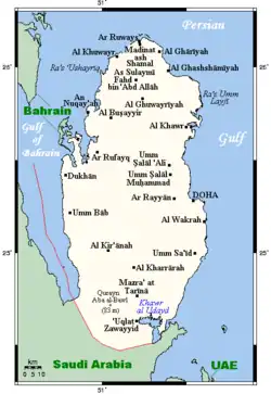 Of the islands belonging to Qatar, Halul is the most important.[1] Lying about 90 km (56 mi) east of Doha, it serves as a storage area and loading terminal for oil from the surrounding offshore fields.[1] Hawar and the adjacent islands immediately off the west coast are the subject of a territorial dispute between Qatar and Bahrain.[1]