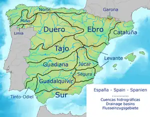 The major rivers flowing westward throughout the Meseta Central include the Duero, the Tagus, the Guadiana, and the Guadalquivir.[3] The Rio Guadalquivir is one of the most significant rivers in Spain because it irrigates a fertile valley, thus creating a rich agricultural area, and because it is navigable inland, making Seville the only inland river port for ocean-going traffic in Spain.[3] The major river in the northwest region is the Miño.[3]