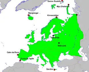 Physically, Switzerland is situated approximately in the middle of the portion of Europe west of the Carpathian Mountains. Defining the Ural Mountains as the eastern limit of the continent, Switzerland is located within the western third of Europe, approximately 15 degrees of longitude away from the extreme west and 50 degrees away from extreme east.[33] Phytogeographically, the part of Switzerland that lies north of the Alps belongs to Central Europe, while the part south of the Alps belongs to Southern Europe.[34]