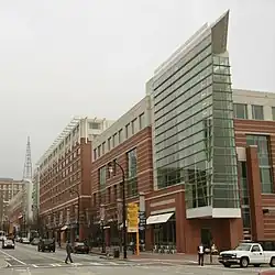 Tech's administrative buildings, such as Tech Tower, and the Bursar's Office, are also located on the Central Campus, in the recently renovated Georgia Tech Historic District.[66][67] The campus library, the Fred B. Wenn Student Center, and the Student Services Building ("Flag Building") are also located on Central Campus. The Student Center provides a variety of recreational and social functions for students including: a computer lab, a game room ("Tech Rec"),[68] the Student Post Office, a music venue, a movie theater, the Food Court, plus meeting rooms for various clubs and organizations. Adjacent to the eastern entrance of the Student Center is the Kessler Campanile (which is referred to by students as "The Shaft").[69] The former Hightower Textile Engineering building was demolished in 2002 to create Yellow Jacket Park. More greenspace now occupies the area around the Kessler Campanile for a more aesthetically pleasing look, in accordance with the official Campus Master Plan.[70] In August 2011, the G. Wayne Clough Undergraduate Learning Commons opened next to the library and occupies part of the Yellow Jacket Park area.[71]
