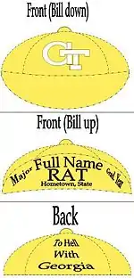 Every year, a number of freshmen, most notably those in the marching band,[31] wear gold caps known as RAT caps at each football game. RAT is short for Recruit At Tech, although freshmen are sometimes addressed as RATS, or "Recruits at Tech", the often cited "Recently Acquired Tech Student" is not the true meaning.[32] The RAT caps are decorated with the football team's scores, the freshman's name, hometown, major, expected graduation date, and "To HELL With georgia" emblazoned on the back of the cap. Freshmen, or RATs, in the band are expected to wear their RAT caps during all official band functions, including rehearsals and football games.