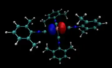 Similar to the Ge(II) carbene complex, the Ge-C bond lengths in the Ge(II) (2,6-dimethylphenyl isocyanide)3 structure range between 2.03-2.07 Å, typical for expected Ge-C bonds.[3] The ligands adopt a distorted tetrahedral structure about the germanium center in the crystal structure.[3] NBO analysis of the Ge(II) isocyanide dication reveals a partially filled Ge p orbital as a frontier orbital of this complex, depicted to the right. The nature of the frontier orbitals change upon consideration of the GeCl3− counter anions in the NBO analysis. The NBO analysis also reveals a charge of +0.74 on Ge, with some positive charge delocalized on the isocyanide ligands.[3] Geometry optimizations for both singlet and triplet electron configurations were performed for this complex, and the singlet was found to be favored by 48.6 kcal/mol.[3]