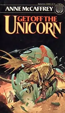 Get Off the Unicorn is a collection of science fiction short stories by American writer Anne McCaffrey, first published in paperback by Del Rey Books in June 1977. Eleven of the fourteen stories were previously published in various magazines and anthologies. Initial sales were brisk; two additional printings were required by year's end. Del Rey reprinted Get off the Unicorn regularly throughout the 1970s and 1980s, and its edition remains in print as of 2015. Corgi issued a British edition in 1979 and an Australian edition in 1980.[1] An audiobook based on the Corgi edition was released in 1985.[2] Severn House issued a hardcover edition in 1982.[1]