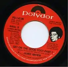 "Get on the Good Foot" is a funk song performed by James Brown. It was released in 1972 as a two-part single that charted #1 R&B and #18 Pop.[1][2] It also appeared on an album of the same name released that year. Partly due to the unwillingness of Brown's record labels to certify sales of his previous hits, "Get on the Good Foot" was his first gold record.[3] Billboard ranked it as the No. 99 song for 1972.[4]