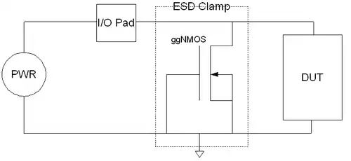 As the name implies, a ggNMOS device consists of a relatively wide NMOS device in which the gate, source, and body are tied together to ground. The drain of the ggNMOS is connected to the I/O pad under protection. A parasitic NPN bipolar junction transistor (BJT) is thus formed with the drain (n-type) acting as the collector, the base/source combination (n-type) as the emitter, and the substrate (p-type) as the base. As is explained below, a key element to the operation of the ggNMOS is the parasitic resistance present between the emitter and base terminals of the parasitic npn BJT. This resistance is a result of the finite conductivity of the p-type doped substrate.