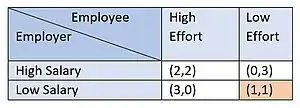 As this game is considered a perfect information game where all players are aware of previous actions, backwards induction can also be used to determine the equilibrium of this game. As both players are rational, they will both work to maximise their utility. Looking at game tree shown on the right, the last decision is determined by the employee. The utilities for the employer and employee are outlined in red and blue respectively. In both a high and low salary option, the employee will benefit more from choosing the low effort option. In a high salary path, the high effort choice yields a utility of 2 for the employee whereas in the low effort path the utility is 3. In the low salary high effort path, the employees utility will be 0 compared to the low effort choice which results in a utility of 1. Thus the employee will choose low effort regardless of the salary choice made by the employer. Moving a decision back, it is now the employers choice between high or low salary. Knowing the employee will choose low effort, the employer will also choose the option that maximises their utility. In the high salary low effort option, their utility eventuates to 0 whereas in the low salary low effort option, their utility is 1. Knowing the employee will choose the low effort option as it maximises their utility, the employer will choose low salary. This will lead to the equilibrium of low salary and low effort.