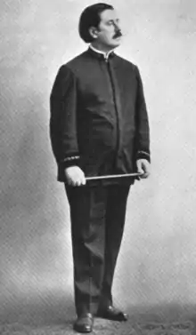 Giuseppe Creatore (/ˈkriːətɔːr/), called the Great Creatore, was an Italian bandmaster in Italy and the United States. He was born in Naples, Italy on June 21, 1871, and died in New York City on August 15, 1952.[1] Creatore's fame rivaled that of John Philip Sousa, and he was known for performances that were engaging for both their showmanship and musicianship.[2] The music critic of the Kansas City Journal provides a colorful description of Creatore's stage presence: "Creatore starts the band in a mild, entreating way. A simple uplifting of the arms. Then suddenly, with a wild shake of his shaggy head, he springs across the stage with the ferocity of a wounded lion. Crash! Bang! And a grand volume of sound chocks the hall from pit to dome."[3]