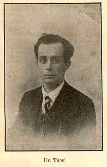 Tucci was a supporter of Italian Fascism and Benito Mussolini.[3] His collaboration began in his student days at the University of Rome, where he first met Giovanni Gentile (at the time, Professor of the History of Philosophy and already a close friend and collaborator of Mussolini), and continued right up to Gentile's assassination in 1944, which led to the forced closure of IsMEO for over two years until 1947.[5] In November 1936 - January 1937 he was the representative of Mussolini in Japan, where he was sent to improve the diplomatic relations between Italy and Japan and to make Fascist propaganda. On 27 April 1937 he gave a speech on the radio in Japanese on Mussolini's behalf.[6] In this country his action paved the way to the inclusion of Italy to the Anti-Comintern Pact (6 November 1937).[7] Tucci was a member of the editorial board of an Italian propaganda magazine, Yamato, which was started in 1941 to improve the political alliance of Italy and Japan.[8]