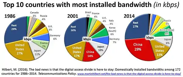 There is a large inequality worldwide in terms of the distribution of installed telecommunication bandwidth. In 2014 only three countries (China, US, Japan) host 50% of the globally installed bandwidth potential (see pie-chart Figure on the right).[2] This concentration is not new, as historically only ten countries have hosted 70–75% of the global telecommunication capacity (see Figure). The U.S. lost its global leadership in terms of installed bandwidth in 2011, being replaced by China, which hosts more than twice as much national bandwidth potential in 2014 (29% versus 13% of the global total).[2]