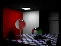 Rendering with global illumination. Light is reflected by surfaces, and colored light transfers from one surface to another. Notice how color from the red wall and green wall (not visible) reflects onto other surfaces in the scene. Also notable is the caustic projected onto the red wall from light passing through the glass sphere.