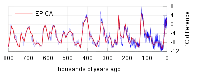 - Petit, J. R.; Jouzel, J.; Raynaud, D.; Barkov, N. I.; Barnola, J. M.; Basile, I.; Bender, M.; Chappellaz, J.; Davis, J.; Delaygue, G.; Delmotte, M.; Kotlyakov, V. M.; Legrand, M.; Lipenkov, V.; Lorius, C.; Pépin, L.; Ritz, C.; Saltzman, E.; Stievenard, M. (1999). "Climate and Atmospheric History of the Past 420,000 years from the Vostok Ice Core, Antarctica". Nature. 399 (6735): 429–436. Bibcode:1999Natur.399..429P. doi:10.1038/20859. S2CID 204993577.
