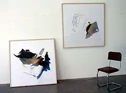 In the mid-1980s she developed a technique of painting on wooden panels with a mixture of kaolin and hide glue, similar to the method used in the making of Tibetan tankas, which she then drew over with graphite.[4] Graham has stated however that when she first began using kaolin, that she was unaware of the connection to Tibetan painting.[5] Other materials she has used include aluminum, transparent paper, and graphite.[6] In her Famine Series, the flags of eight African countries were painted on used damask napkins, a comment on our relationship to the fed and to the hungry.[7]