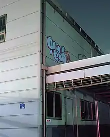 - All train cars (usually between four and eight or more, regardless of the train length) completely covered with paint reaching the far end of the train on one or both sides. Such demanding actions are often done by multiple participants or crews and with a limited variation of colors – commonly in black and silver – because of the stressing time limitation they are facing when painting in the train yards (very often less than 30 minutes). However, the more participants who participate, the better works can come out of it and the cars are done quicker too. This type of graffiti, if finished successful, is one of the most respected forms among other graffitists, but is also rarer due to the higher risk of getting caught. it has also been known that 'crews' of graffiti participants would demonstrate their 'whole cart/train' skills, usually carried out by waiting at a train/metro stop or station, waiting for the train to approach. then when stopped quickly cover the full area of the cart, this can be finished within 2 minutes of the train pulling into the station.