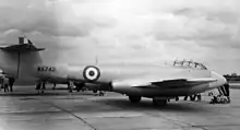 Several Meteor F.3s were converted into navalised aircraft. The adaptations included a strengthened undercarriage and arrester hook. Operational trials of the type took place aboard HMS Implacable. The trials included carrier landings and takeoffs.[54] Performance of these naval prototype Meteors proved to be favourable, including takeoff performance, leading to further trials with a modified Meteor F.4 fitted with folding wings; a 'clipped wing' was also adopted.[55] The Meteor later entered service with the Royal Navy, but only as a land-based trainer, the Meteor T.7, to prepare pilots of the Fleet Air Arm for flying other jet aircraft such as the de Havilland Sea Vampire.[56]