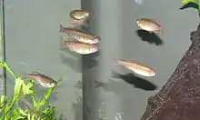 The glowlight danio (Danio choprae) is a small, schooling fish closely related to the popular zebrafish Danio rerio. This should not be confused with the GloFish , a trademarked brand of fluorescent zebrafish that appear to glow in the dark under ultraviolet light. Danio choprae is an active danionin species that spends most of its time on mid-water levels. This species feeds on insects that have fallen into the water, aquatic insect larvae, and other small animals. In the aquarium, it accepts most foods offered, including most dry foods. It has a streamlined body marked with a brilliant orange longitudinal band and a series of vertical blue-black bars on the flanks. The fins are edged with yellow. In recent years, it has become quite widely traded as an aquarium fish, but otherwise has no commercial importance. Its common name derives from its similarity to the glowlight tetra, a South American characin only distantly related to this fish. They get on well with all other Danio species except the giant danio.