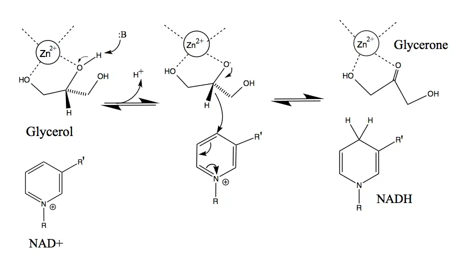 After NAD+ is bound to the enzyme, glycerol substrate binds to the active site in such a way as to have two coordinated interactions between two adjacent hydroxyl groups and the neighboring zinc ion. GlyDH then catalyzes the base-assisted deprotonation of the C2 hydroxyl group, forming an alkoxide. The zinc atom further serves to stabilize the negative charge on the alkoxide intermediate before the excess electron density around the charged oxygen atom shifts to form a double bond with the C2 carbon atom. Hydride is subsequently removed from the secondary carbon and acts as a nucleophile in electron transfer to the NAD+ nicotinamide ring. As a result, the H+ removed by the base is released as a proton into the surrounding solution; followed by the release of the product glycerone, then NADH by GlyDH.[11]