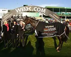 Ridden by jockey Davy Condon, Go Native, a 25-1 longshot, went on to win the 2009 Fighting Fifth Hurdle at Newcastle Racecourse in Newcastle, England, defeating Sublimity by 2.5 lengths.[6] He followed up his win at Newcastle by winning the Christmas Hurdle at Kempton Park Racecourse in Surrey, England, where he beat a strong finishing Starluck by a short head, keeping him in the running to become the first horse to win the £1m Triple Crown of Hurdling bonus offered by WBX.[7][8] With Paul Carberry at the helm after serving his suspension, Go Native entered the Champion Hurdle as a 4-1 favorite.[9] However, he failed to jump the second hurdle cleanly and was unable to recover, finishing the race in 10th place.[10][11] Noel Meade, speaking of Go Native after the race, was quoted as saying: He just dived at the second and that was the end of his race, so he must have hurt himself in some way. If he's OK we'll look at Punchestown.[12]
