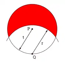 The final summation A1 + (A2  A3 + A4) · 2 is . All imprecision in the calculation is now uncertainty in and the residual . . That's useful for elucidating the relationships between the parameters. is transcendental, so the definition is a recurrence relation. The initial guess is a small fraction of . The numerical answer is rounded up to the nearest square yard.[4] It is worth noting that , which is the answer given for the case where the tether length is half the circumference (or any length such that ) of the silo, or no overlap to account for. The goat can eat all but 5% of the area of the great circle defined by its tether length, and half the area it cannot eat is within the perimeter of the pond/silo. The only imprecision in the calculation is that no closed-form representation for can be derived from the geometry presented. But small inaccuracies in when don't significantly affect the final result.