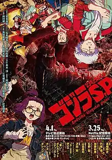 On October 6, 2020, Toho Animation and Netflix announced plans for an anime Godzilla series, titled Godzilla Singular Point, it aired from April 1 to June 24, 2021 on Tokyo MX and other channels. Production for the show is by Bones in partnership with Orange, blending hand-drawn and computer animation styles respectively. Atsushi Takahashi served as the director with scripts by Toh EnJoe, and music composed by Kan Sawada. Character design was handled by Blue Exorcist manga creator Kazue Kato, with former Studio Ghibli animator Eiji Yamamori designing the monsters.[4][5] The series' opening theme, "in case...", is performed by BiSH, while Polkadot Stingray performed the ending theme song "Aoi" (青い, Blue).[6] There is also the recurring insert theme "ALAPU UPALA", performed by Indian-American singer Annette Philip, which is utilized in the storyline as a deus ex machina. The series debuted earlier on Netflix in Japan on March 25, 2021,[7] which was followed by a global release on June 24, 2021.[8]