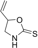 Goitrin is a sulfur-containing oxazolidine, a cyclic thiocarbamate, that reduces the production of thyroid hormones such as thyroxine.[1] It is found in cruciferous vegetables such as cabbage, brussels sprouts and rapeseed oil,[2] and is formed by the hydrolysis of a glucosinolate: progoitrin or 2-hydroxy-3-butenyl glucosinolate. The unstable isothiocyanate (2-hydroxy-3-butenyl isothiocyanate) derived from the latter glucosinolate spontaneously cyclizes to goitrin, because the hydroxy group is situated in proximity to the isothiocyanate group (allowing a five-membered ring to be formed). Hence, the oxygen in the molecule stems from the hydroxy group of the original unstable isothiocyanate. Plants containing this specific glucosinolate (or glucosinolates such as glucobrassicin and sinalbin which liberate thiocyanate ion) have goitrogenic potential due to the goitrin and thiocyanate they contain. However, they do not seem to alter thyroid function in humans at realistic amounts in the diet.[3]