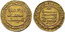 The gold dinar (Arabic: ﺩﻳﻨﺎﺭ ذهبي) is an Islamic medieval gold coin first issued in AH 77 (696–697 CE) by Caliph Abd al-Malik ibn Marwan. The weight of the dinar is 1 mithqal (4.25 grams or 0.137 troy ounces).