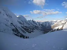The Gondogoro La, though popular with trekkers, involves Class 4 climbing with crampons. The northeast side has up to 50-degree snow slopes with avalanche danger requiring fixed ropes. The southwest side is a longer, continuous 50-degree slope with rock-fall and avalanche danger that requires fixing as much as 300 meters of rope. Yahya Aziz, aged 10 from Lahore Pakistan crossed the Gondogoro La on July 17, 2021, becoming the youngest to cross.