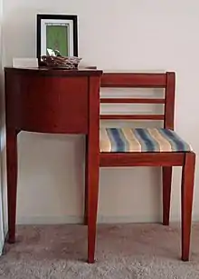 A gossip bench or telephone table is a piece of furniture that includes a chair with an attached side table on one end, sometimes with built-in storage such as drawers or a magazine rack.[1]