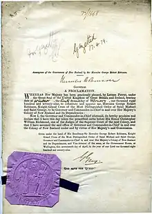 The monarch of New Zealand appoints the governor-general on the sole recommendation of the prime minister of New Zealand,[11] by commission issued under the Seal of New Zealand,[6][12] known as the "Terms of Appointment".[13]
