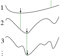 It can be shown inductively that if these conditions are met, then a hill climber will arrive at the global optimum for the difficult problem. Unfortunately, it can be difficult to find a sequence of optimization problems that meet these conditions. Often, graduated optimization yields good results even when the sequence of problems cannot be proven to strictly meet all of these conditions.