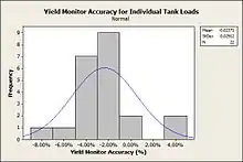The grain yield monitor is an excellent tool that provides producers an effective evaluation tool on a field and farm basis. The accuracy of the yield monitor is approximately 1-3% when properly calibrated, but is on an averaging basis for this accuracy.[9] On a pass to pass basis the accuracy decreases significantly with a range of accuracy of 0-10% error in most studies.[10][11][12] The average of multiple loads remains within the projected 1-3%, but individual loads have a much higher variability. These errors are present from issues listed in the "Impact Based Mass Flow Measurement" section of this page. The effects of individual load variability limits its ability to be used for smaller scale comparison such as test plot comparisons. Test plots are usually single planted strips of a single crop hybrid at approximately the width of the combine harvester head. Harvesting a test plot results in single harvested load and yield estimation for the single hybrid. Comparing one hybrid to another based on single loads can be difficult as the load is essentially a sub sample of a larger mean.[13]