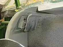 Grain mass flow is most commonly measured using a load cell with an impact plate attached to the load cell located at the top of the clean grain elevator. As the clean grain elevator paddles rotate around the top of the clean grain elevator, the grain is expelled from the elevator by centrifugal force and makes contact with the impact plate attached to the load cell.[2] The force applied by the grain is converted to an electrical signal by the load cell that is used to estimate the mass flow of the grain. A calibration of the sensor to develop a relationship of the amplitude of the electrical signal to grain mass flow and is calibrated on a harvester specific basis with the grain mass reported on a wet basis. This technology was developed and first commercialized by Ag Leader Technology.[1][3] The clean grain elevator speed is also measured and used in the calibration from electrical signal to mass flow as the elevator has a direct impact on the amount of force applied to the impact plate and load cell. This is the most common method for measuring grain flow in harvesters today and exists in different variations.