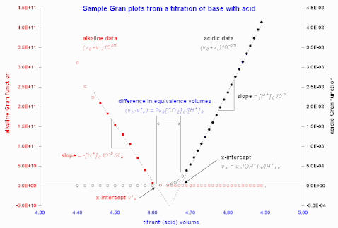 - modified Gran function plots are drawn, using vs. on the acidic side of equivalence and vs. on the alkaline side, and the equivalence volumes and are computed therefrom, as before;