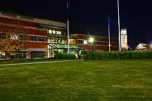 The university's main and original campus in Allendale is the site of most of the university's programs. The Allendale campus is composed of 1,322 acres perched above the Grand River next to a system of ravines and is divided into two areas, north and south campus, separated by West Campus Drive.[27][28] State highway M-45 links the campus in suburban Allendale to US Highway 31/Lake Michigan to the west and Grand Rapids, Michigan to the east. Lubbers Stadium, the GVSU Fieldhouse and all other athletic facilities for the school's 19 varsity sports are also on the Allendale campus. The campus is dotted with many sculptures, including works by Dale Eldred, Joseph Kinnebrew and James Clover. Academic facilities on the Allendale campus include 122 classrooms, 144 research laboratories, 20 lab prep rooms, 21 computer labs, and the Mary Idema Pew Library Learning and Information Commons.[29] The Allendale campus is also home to the Kindschi Hall of Science, a science facility that opened in the fall of 2015.[30]