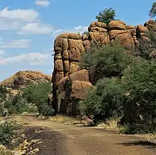 The precambrian[4] Dells' granite has been theoretically dated at 1.4 billion years old. Its pluton was intruded at a depth of around one or two miles (1.6 to 3.2 km). These cover rocks have since been eroded away. Weathering along joints produced the rounded boulders and other unusual rock formations that characterize the Granite Dells. This process is called spheroidal weathering, and is common in granitic terrains.[5]