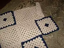 A granny square is a piece of square fabric produced in crochet by working in rounds from the center outward. Granny squares are traditionally handmade as crochet cannot be manufactured by machine. They resemble coarse lace. Although there is no theoretical limit to the maximum size of a granny square, crocheters usually create multiple small squares (called "motifs") and assemble the pieces to make clothing, purses, Afghan blankets, and other household textiles.