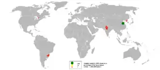 According to the United States Geological Survey (USGS), world production of natural graphite in 2016 was 1,200,000 tonnes, of which the following major exporters are: China (780,000 t), India (170,000 t), Brazil (80,000 t), Turkey (32,000 t) and North Korea (6,000 t).[75] Graphite is not currently mined in the United States, but there are many historical mine sites including ones in Alabama, Montana, and in the Adirondacks of NY.[76] Westwater Resources is in the development stages of creating a pilot plant for their Coosa Graphite Mine near Sylacauga, Alabama.[77] U.S. production of synthetic graphite in 2010 was 134,000 t valued at $1.07 billion.[47]