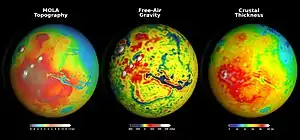 The latest gravity model for Mars is the Goddard Mars Model 3 (GMM-3), produced in 2016, with spherical harmonics solution up to degree and order 120.[13] This model is developed from 16 years of radio tracking data from Mars Global Surveyor (MGS), Mars Odyssey and Mars Reconnaissance Orbiter (MRO), as well as the MOLA topography model and provides a global resolution of 115 km.[13] A separate free-air gravity anomaly map, Bouguer gravity anomaly map and a map of crustal thickness were produced along with this model.[13] Compared with MRO110C and other previous models, major improvement of the estimation of the gravity field comes from more careful modeling of the non-conservative forces applied to the spacecraft.[13]
