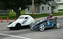 In the UK, gravity racer derbies have recently become more popular, brought to the masses by large events such as the Red Bull Soapbox Race and that held between 2000 and 2004 at the Goodwood Festival of Speed. Now, many small hilly communities organize their own races, such as the Catterline Cartie Challenge in Scotland and the Belchford Downhill Challenge in Lincolnshire, and there are now several dozen known races across the UK.[6] An annual Soap Box Derby has taken place in mid-July at Richard's Castle on the Shropshire/Herefordshire border since 2004.[7][8] In addition to the local community races, there are a small number of races which attract more serious competitors, such as Cairngorm Soapbox Extreme (held at Cairn Gorm from 2009 to 2012) and the Worlaby Downhill Challenge. These races tend to produce higher speeds than the community races. Gravity racers taking part in Cairngorm Soapbox Extreme in 2011 reached speeds of 70 mph.[9]