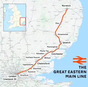 The Great Eastern Main Line (GEML, sometimes referred to as the East Anglia Main Line) is a 114.5-mile (184.3 km) major railway line on the British railway system which connects Liverpool Street station in central London with destinations in east London and the East of England, including Shenfield, Chelmsford, Colchester, Ipswich and Norwich. Its numerous branches also connect the main line to Southminster, Braintree, Sudbury, Harwich and a number of coastal towns including Southend-on-Sea, Clacton-on-Sea, Walton-on-the-Naze and Lowestoft.[1]